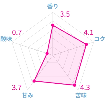 実際に飲むと、ビターチョコレートのような甘さがあり、口に含むとまろやかなコクが広がり、ミディアムボディのワインのような滑らかな口当たりを感じます。苦味はマイルドで抑えられています。酸味はほとんど感じられません。